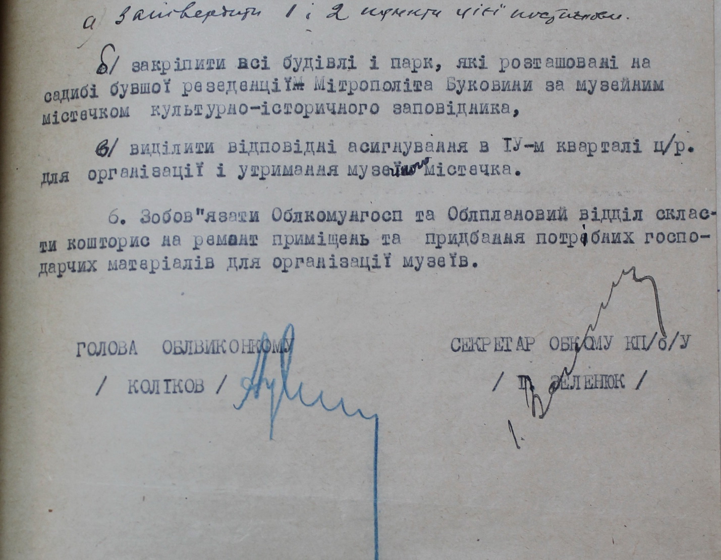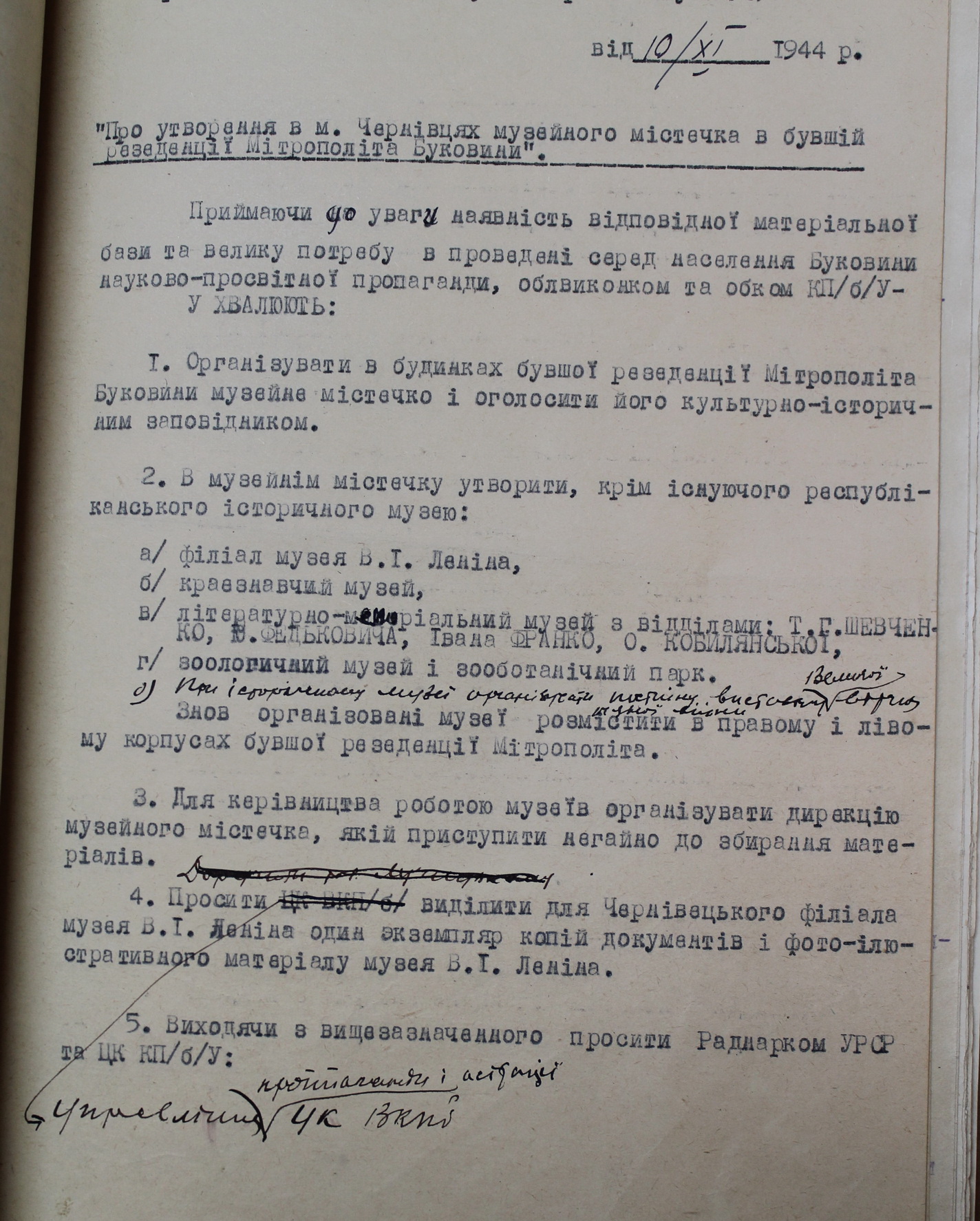 Як не дивно, і на цей випадок у радянської влади був план. План секретаря Чернівецького обкому Івана Зеленюка був складений ще у 1944 році. Зрозуміло, ідей створити Хогвартс замість Резиденції у товариша Зеленюка не було, і він навіть і не думав, щоб запускати туди студентів. Був план саме створення туристичної атракції, музейного містечка. Зокрема, туди мали входити літературні музеї Тараса Шевченка, Юрія Федьковича, Івана Франка, Ольги Кобилянської, краєзнавчий музей, зоомузей і, звісно, музей товариша Леніна. І цікавинка — зоо-ботанічний сад. Ботанічний із переходом у зоосад приблизно там, де зараз Музей буковинської діаспори. Зараз це б назвали — «кластерний підхід» і, зрозуміло, це ідея цілком слушна, тому що туристи люблять їхати на щось конкретизоване, а не для вештання містом (хоча і це полюбляють).