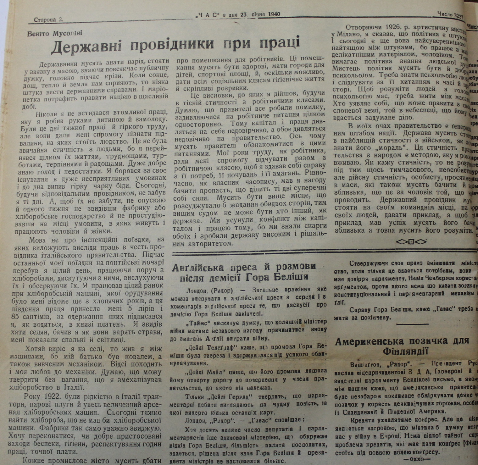 Переглядаючи ті шпальти, я майже впевнився, що чимало співгромадян могли б сьогодні проголосувати, скажімо, за Муссоліні, підтримувати і марширувати. І, мабуть, із тими же наслідками. От і мені стало цікаво, якщо б ви, шановний читачу, читали статті Беніто Муссоліні сьогодні — чи не проголосували б ви часом за нього? Тому вирішив подати статтю Беніто Муссоліні з газети «Час» 1940 року та натхненне описання Риму Муссоліні з того ж часопису.
