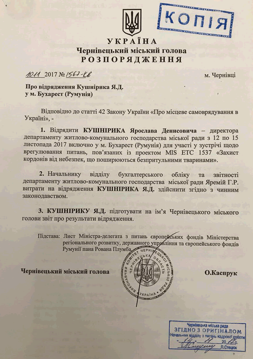 Лист від Европейської комісії, датований 28 червня 2019 р., мав лягти на стіл міському голові* не пізніше середини липня. Це значить, що вже після його отримання мер Олексій Каспрук перевів Ярослава Кушнірика на посаду начальника відділу розвитку територій Чернівецької міської ради. По суті – на підвищення, до того ж у сферу, пов’язану з розподілом кредитів і грантової допомоги. Цього разу – на будівництво мосту через проспект Незалежності за фінансової підтримки Німецького товариства міжнародного співробітництва (Deutsche Gesellschaft für Internationale Zusammenarbeit).