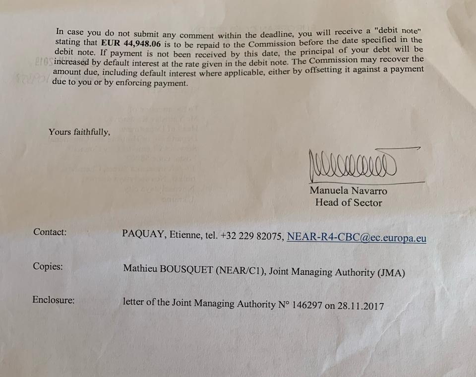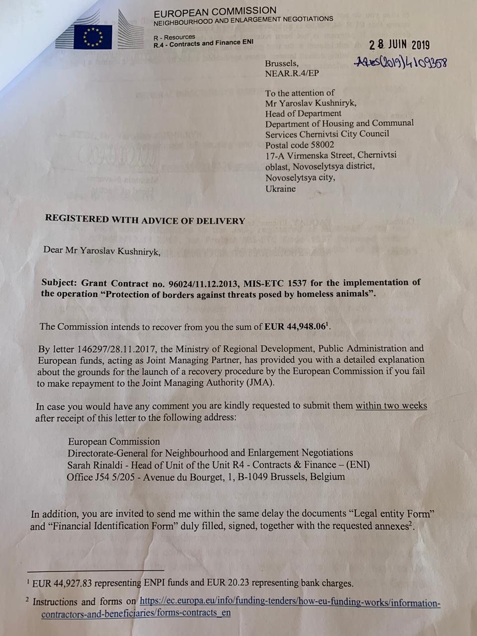 До редакції «Буковинського центру» потрапив документ, який засвідчує, що фінансовий спір Европейської комісії і Чернівецької міської ради про долю 45 тис. евро у транскордонному проекті «Protection of borders against threats posed by homeless animals» («Захист кордонів від небезпек, що поширюються безпритульними тваринами»), розпочатий у 2017 р., вирішений на користь европейських партнерів. Тобто – новим листом міську раду поставлено перед фактом примусового стягнення вказаної суми, яка, за переконанням Европейської комісії та Міністерства регіонального розвитку Румунії, в Чернівцях була використана не за призначенням.