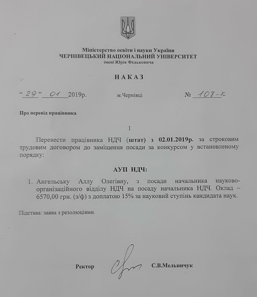 В якості гарантій зі свого боку, ще чинний ректор Степан Мельничук без конкурсу, порушуючи закон «Про наукову та науково-технічну діяльність», призначив доньку свого наступника Аллу Ангельську на посаду начальника Науково-дослідної частини Чернівецького університету. Переведення і призначення на керівний пост відбулось у рекордний термін 29 січня – через день після публікації наказу міністерства про покладання обов’язків ректора ЧНУ на її батька, Олега Ангельського, який через конфлікт інтересів не міг би здійснити цю оборудку сам. Тож зробив це руками фактично відставленого ректора.
