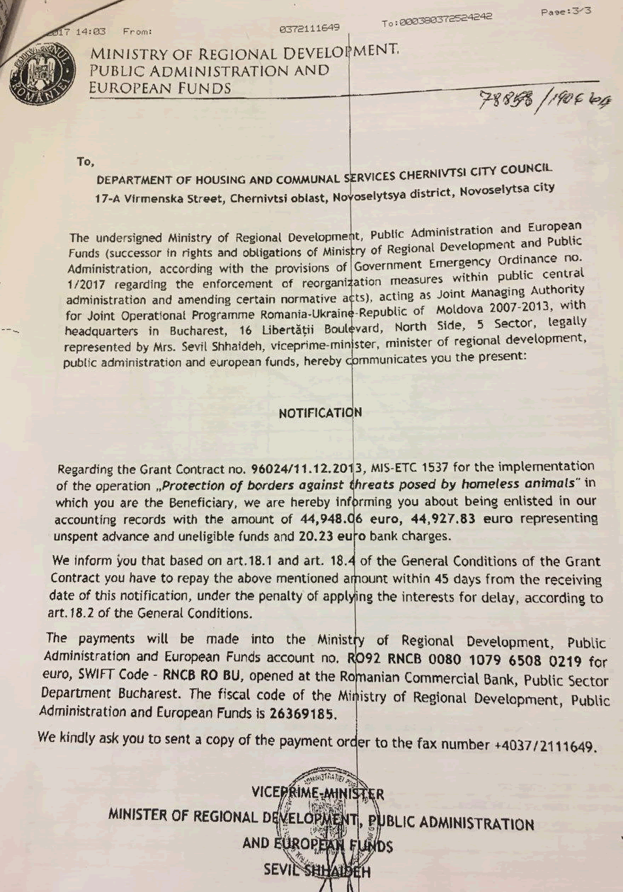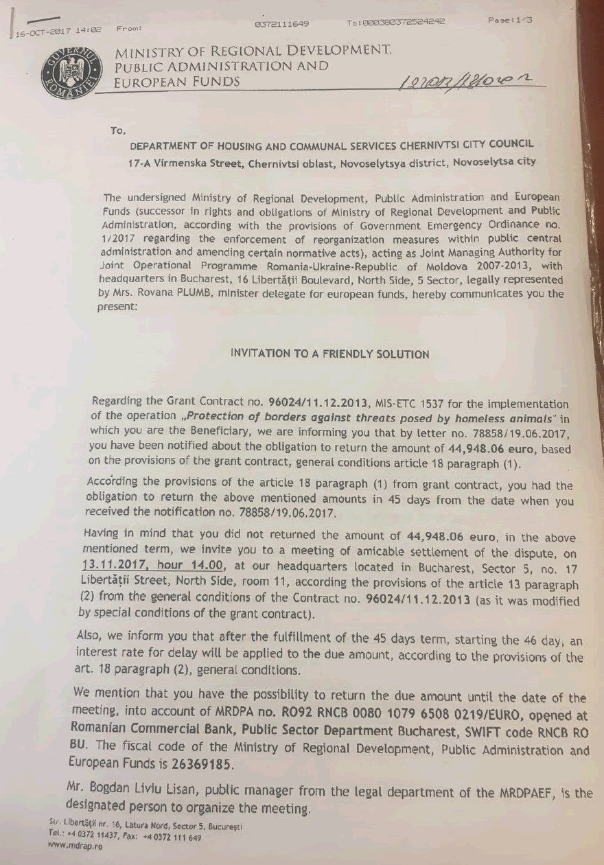 Про що йдеться? Наприкінці жовтня на поштову адресу Чернівецької міської ради* надійшов лист від Міністерства регіонального розвитку Румунії, що є офіційним запрошенням для мирного залагодження («friendly solution») фінансового спору між партнерами транскордонного проекту «Protection of borders against threats posed by homeless animals» («Захист кордонів від небезпек, що поширюються безпритульними тваринами») – тобто сумнозвісного Притулку для тварин. Предметом спору є 44 948 евро, які судячи зі змісту листа, не були витрачені належним чином («unspent advance») і повинні повернутись до европейського фонду.