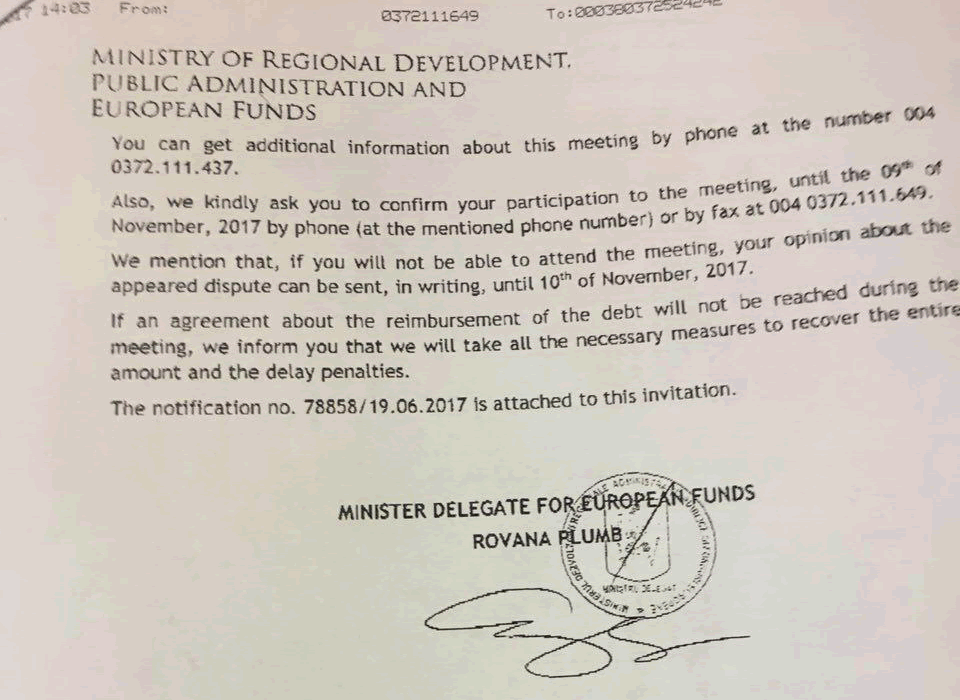 Особливої уваги заслуговує пункт про фінансові санкції («penalty of applying the interests for delay»), введення яких залежатиме від наслідків розмови в Бухаресті («if an agreement about the reimbursement of the debt will not be reached during the meeting»). Про їх застосування було попереджено ще в листі від 19 червня 2017 р. – у новому повідомленні представник румунського міністерства дає зрозуміти, що в разі невиконання умов договору з міською радою довго не гратимуться: «...We will take all the necessary measures to recover the entire amount and the delay penalties».